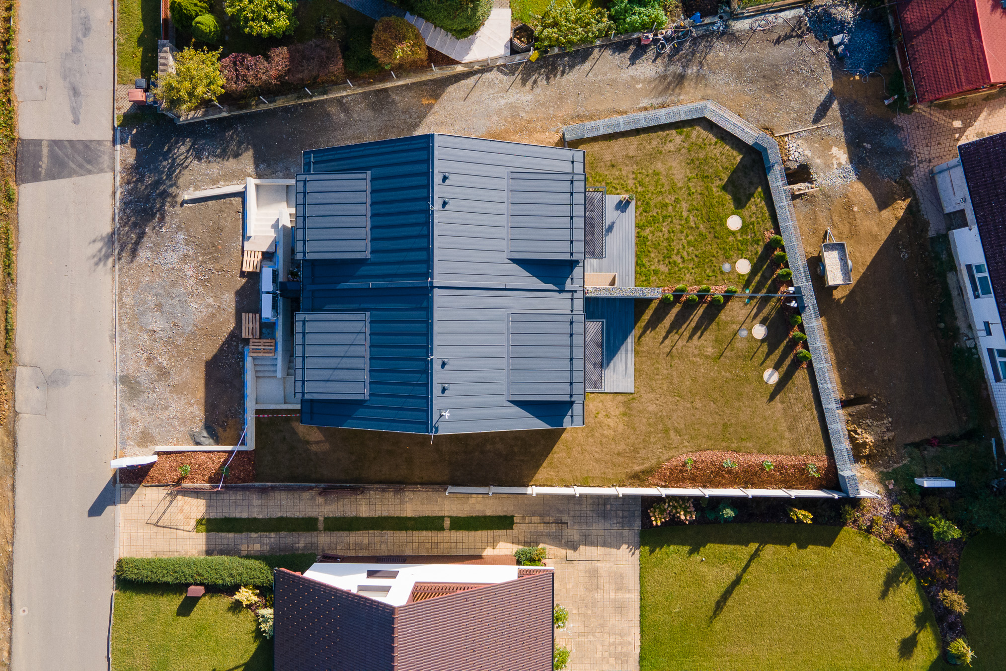 - Střecha je šikmá, zateplená (35 cm), pokryta odolnou plechovou krytinou.
